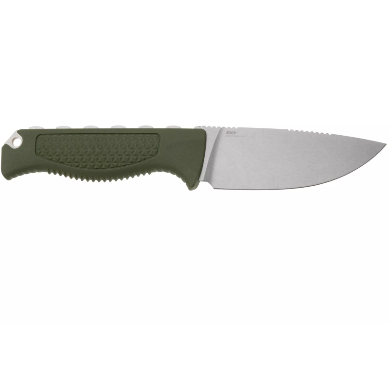 Steep Country Hunter - tai naujas požiūris į medžioklinį peilį. Gamybai panaudotos šiuolaikiškos medžiagos užtikrina ilgalaikį ir saugų naudojimą. Ryški oranžinės spalvos Santoprene rankena puikiai matoma ir dėl specialios rankenos tekstūros užtikrina gerą sukibimą . Todėl netgi dirbant šlapiomis, nešvariomis rankomis galite saugiai ir tiksliai pjauti. Šis modelis labai lengvas: 197mm bendro ilgio peilis sveria tik 85 g . Tai puiki alternatyva sulenkiamiems peiliams, kurių užraktus ir mechanizmus reikia saugoti nuo užteršimo. Nuostabus Crucible Industries nerūdijantis miltelinis plienas S30V yra užgrūdintas iki optimalaus 58-60 HRC kietumo ir puikiai laiko aštrumą. Specialios įrantos pentyje įgalina saugiai spausti peilį iš viršaus- pirštai nenuslys dėka briaunuoto paviršiaus . Šis kompaktinių matmenų peilis praktiškas ir patikimas. Satinuotas geležtės paviršius saugo ją purvo ir paslepia smulkius įbrėžimus, o tvirto termoplastiko rankena atspari temperatūrų svyravimams ir cheminiam poveikiui.