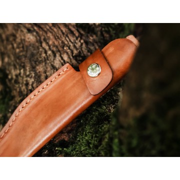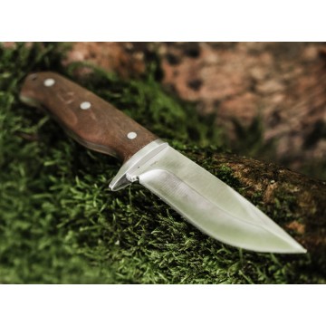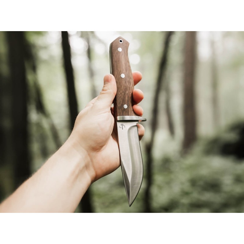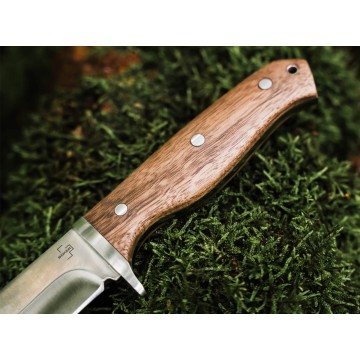Rankena pagaminta iš natūralaus riešutmedžio (walnut wood), kuris suteikia šiltą, premium išvaizdą ir labai patogų, neslystantį sukibimą. Peilis turi full tang konstrukciją su atrama(bolsteriu), dekoratyvinėmis kniedėmis ir tuščiavidure kniede gale virvutei pritvirtinti.