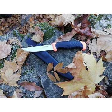 Geležtė iš nerūdijančio 420 plieno su scandi nuolydžiais. Ergonomiška nelystanti rankena iš polipropileno ir gumos su ryškiais oranžiniais intarpais . Patogus plastiko dėklas su kilpa tvirtinimui prie diržo.